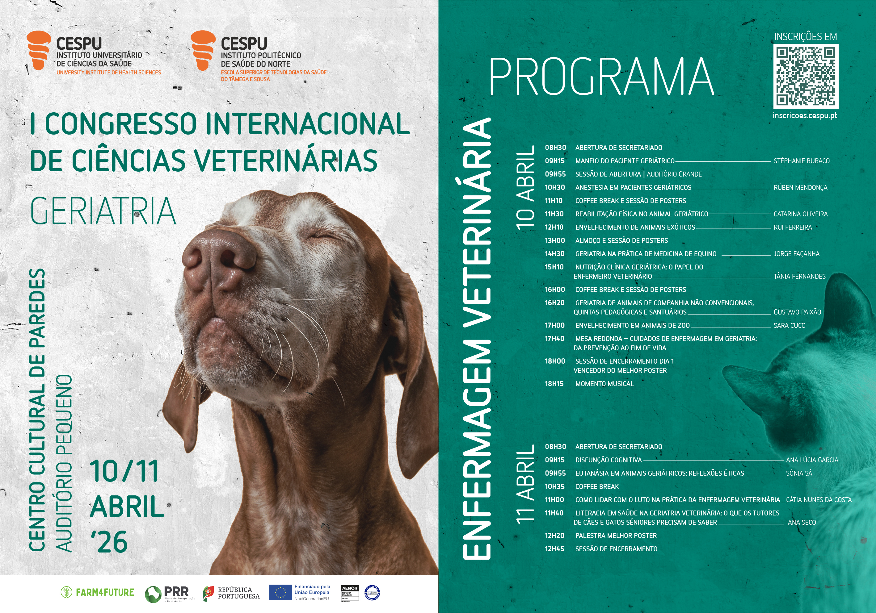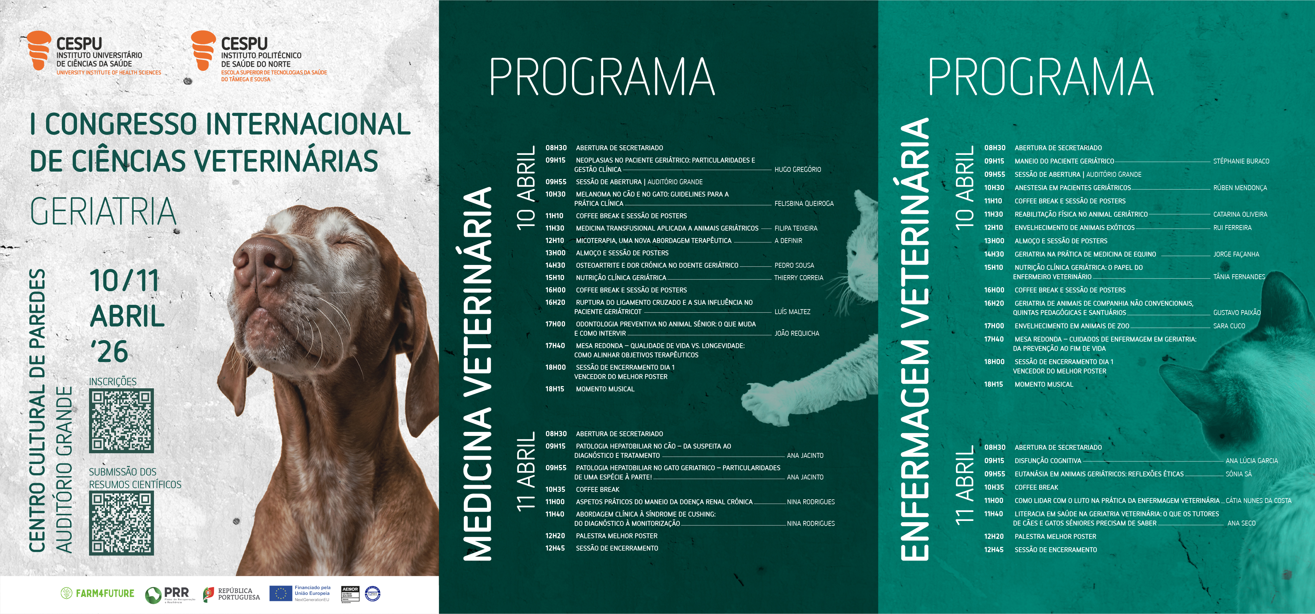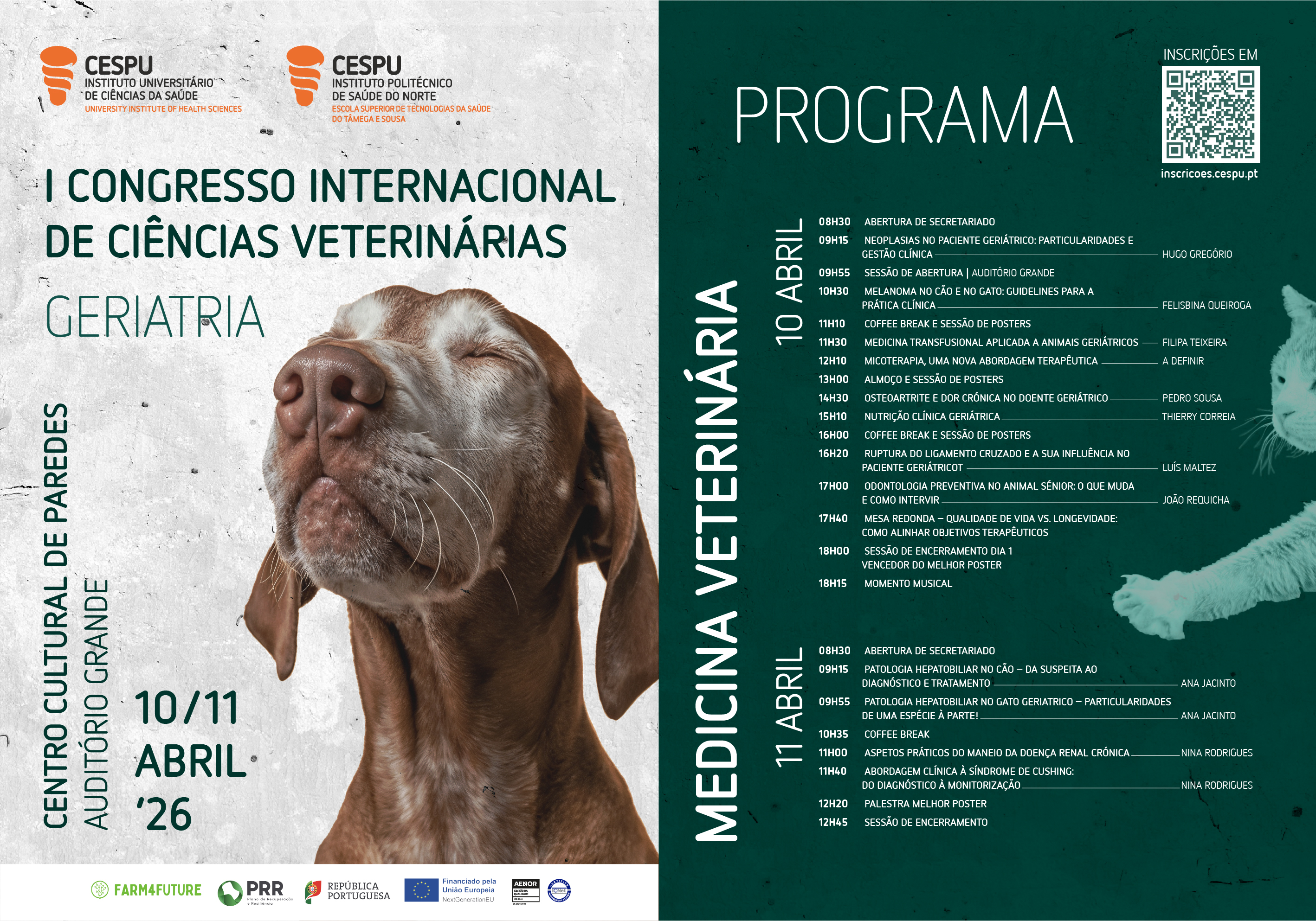 Nos dias 10 e 11 de abril de 2026, realiza-se o I Congresso Internacional de Ciências Veterinárias, uma iniciativa conjunta do Mestrado Integrado em Medicina Veterinária do Instituto Universitário de Ciências da Saúde (IUCS-CESPU) e da Licenciatura em Enfermagem Veterinária da Escola Superior de Tecnologias da Saúde do Tâmega e Sousa (ESTeSTS) do IPSN-CESPU, subordinado ao tema “Geriatria”.